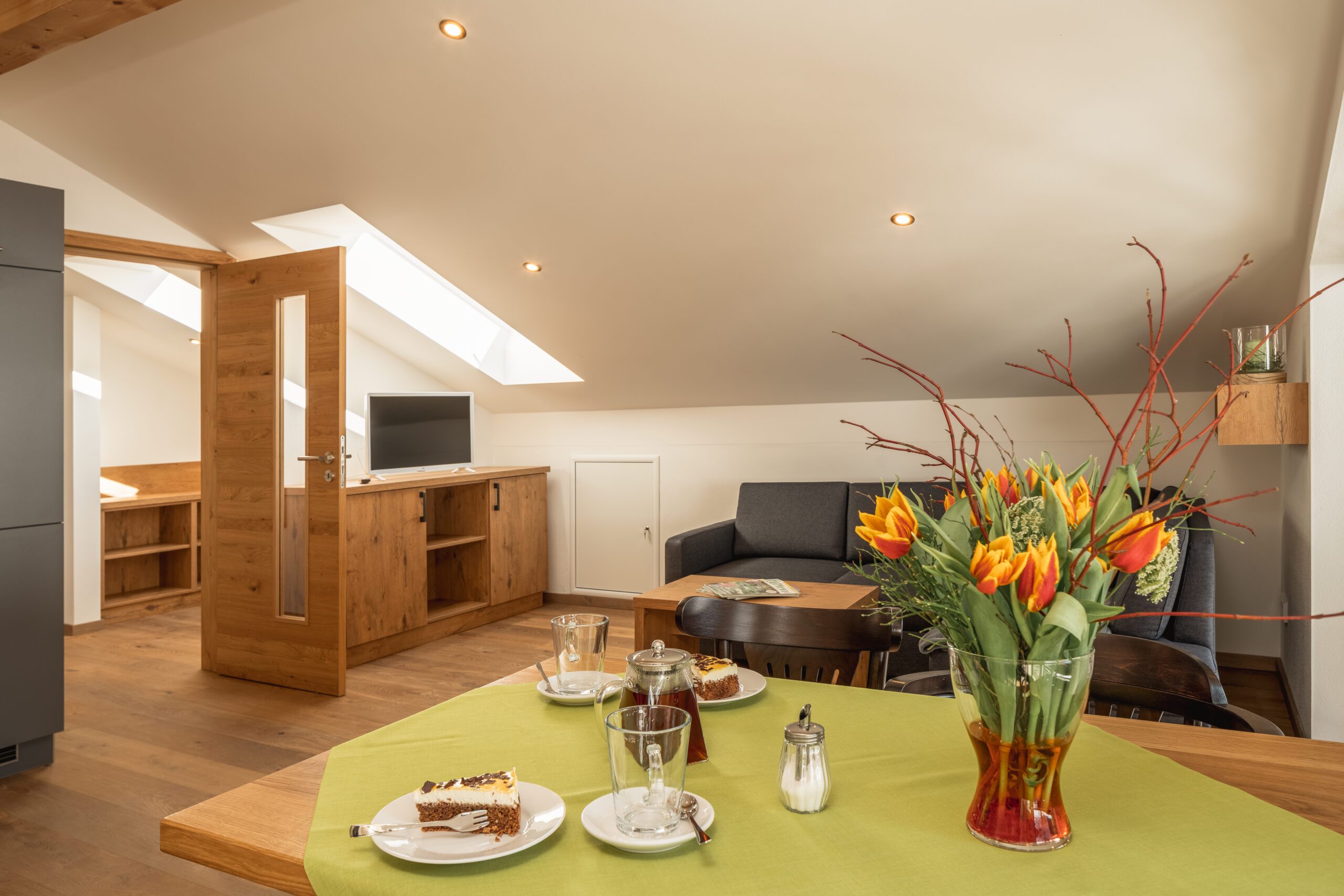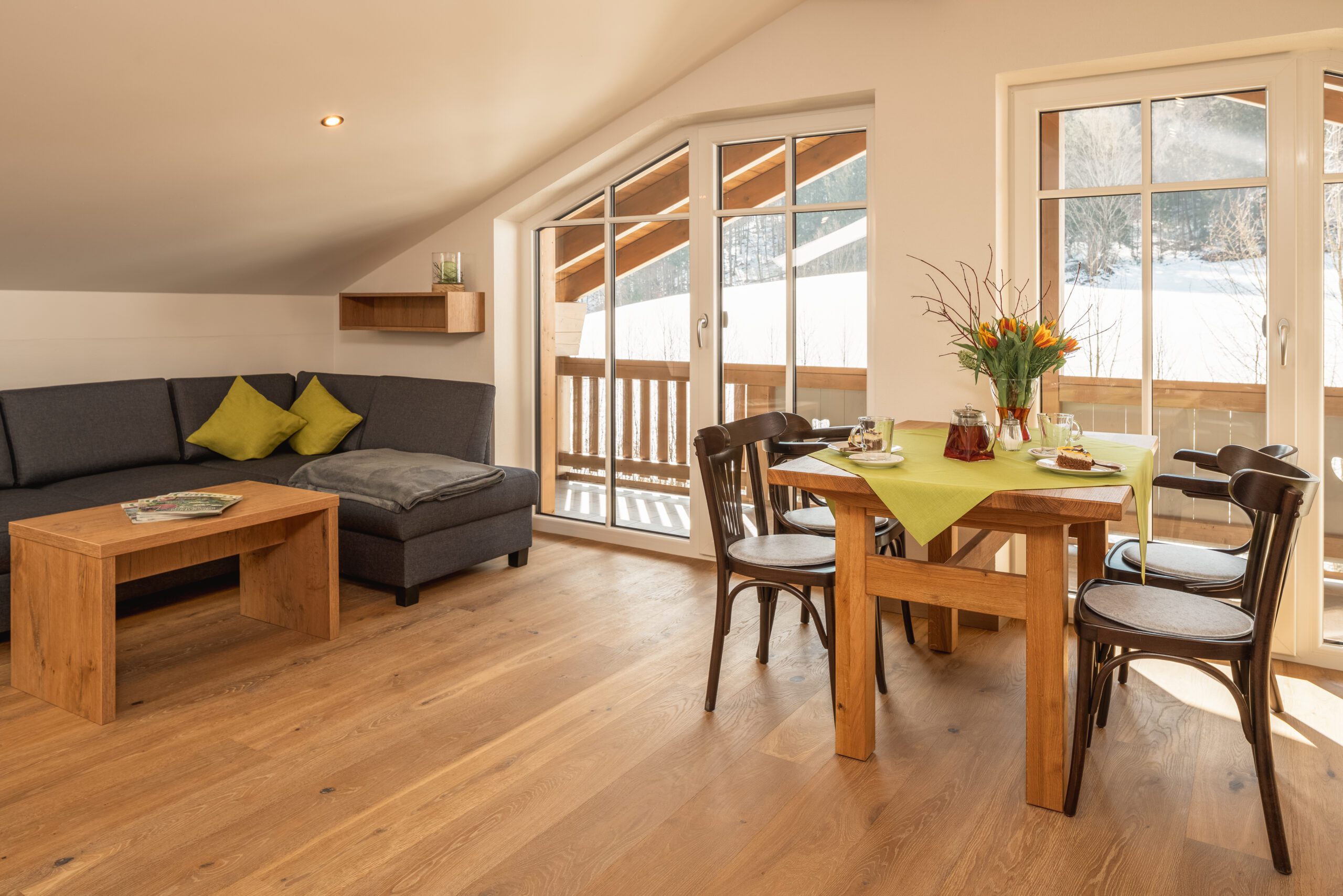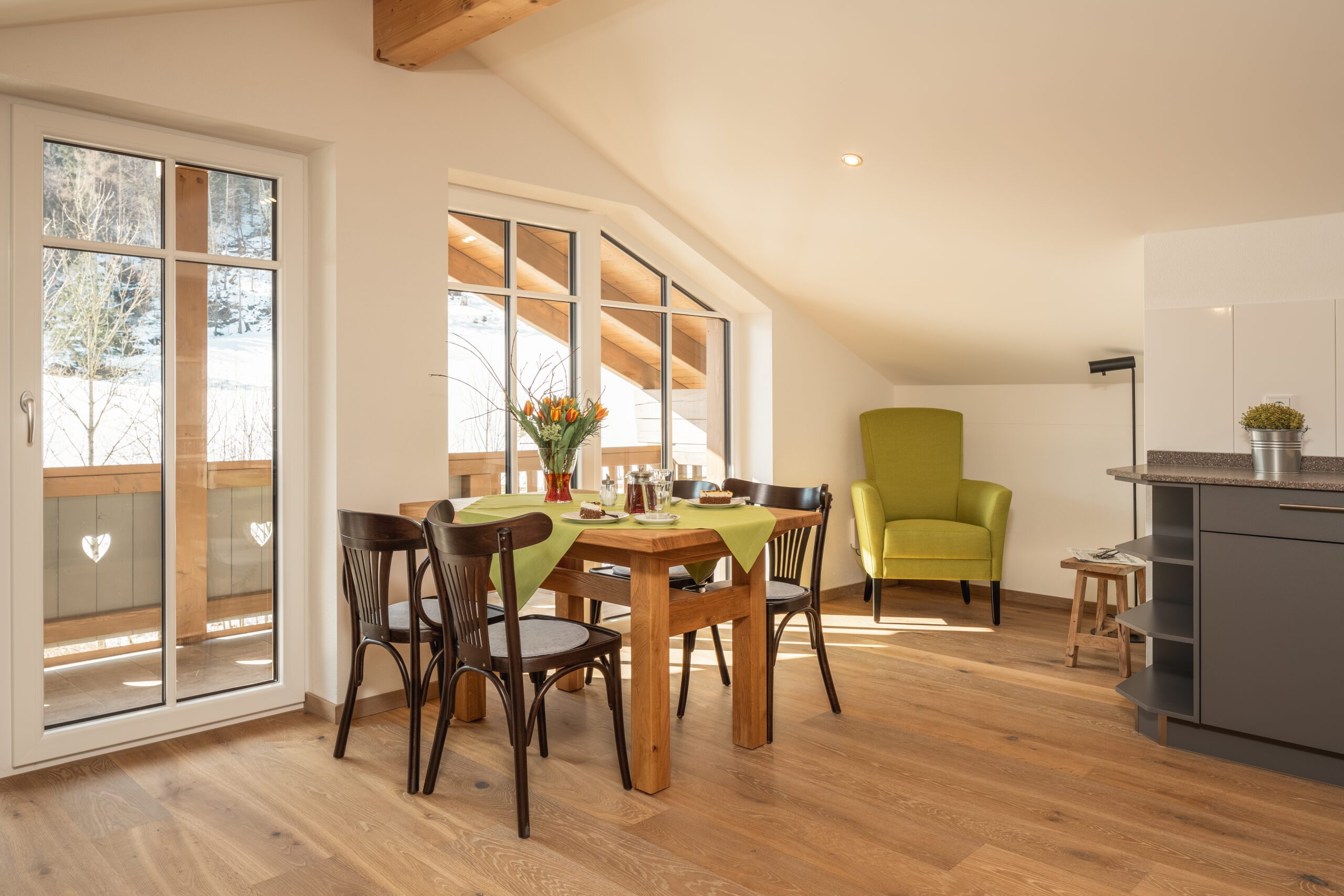 Unsere luxuriöse und einzigartige Suite befindet sich im Dachgeschoss des Hauses und ermöglicht somit einen wundervollen Blick auf das Kaisergebirge und die umliegende Umgebung. Der große Balkon lädt im Sommer zu einem entspannten Frühstück im Freien ein. Dieser grenzt direkt an den großen Wohn- und Essbereich der Suite. Die geräumige Küche lässt keine Wünsche offen. Das Schlafzimmer ist ausgestattet mit einem bequemen Boxspringbett. Auf Wunsch ist eine weitere Schlafmöglichkeit vorhanden. Die Rainshowerdusche und das Dusch – WC im Badezimmer vervollständigen die luxuriöse Suite.