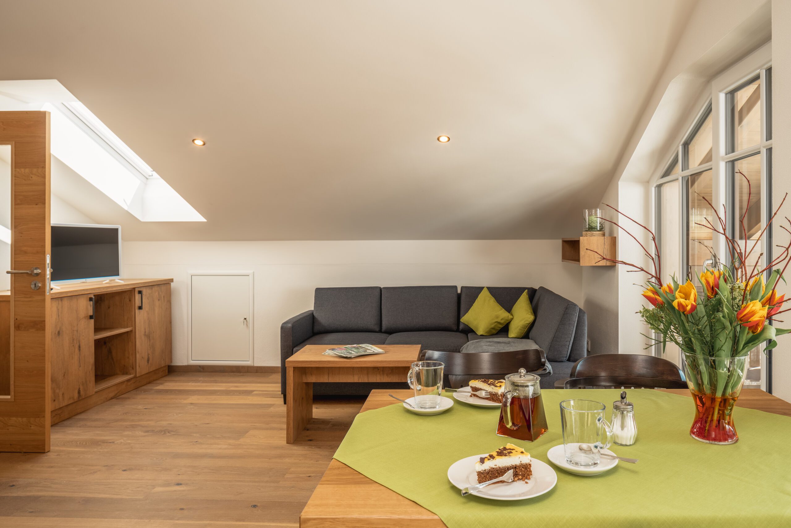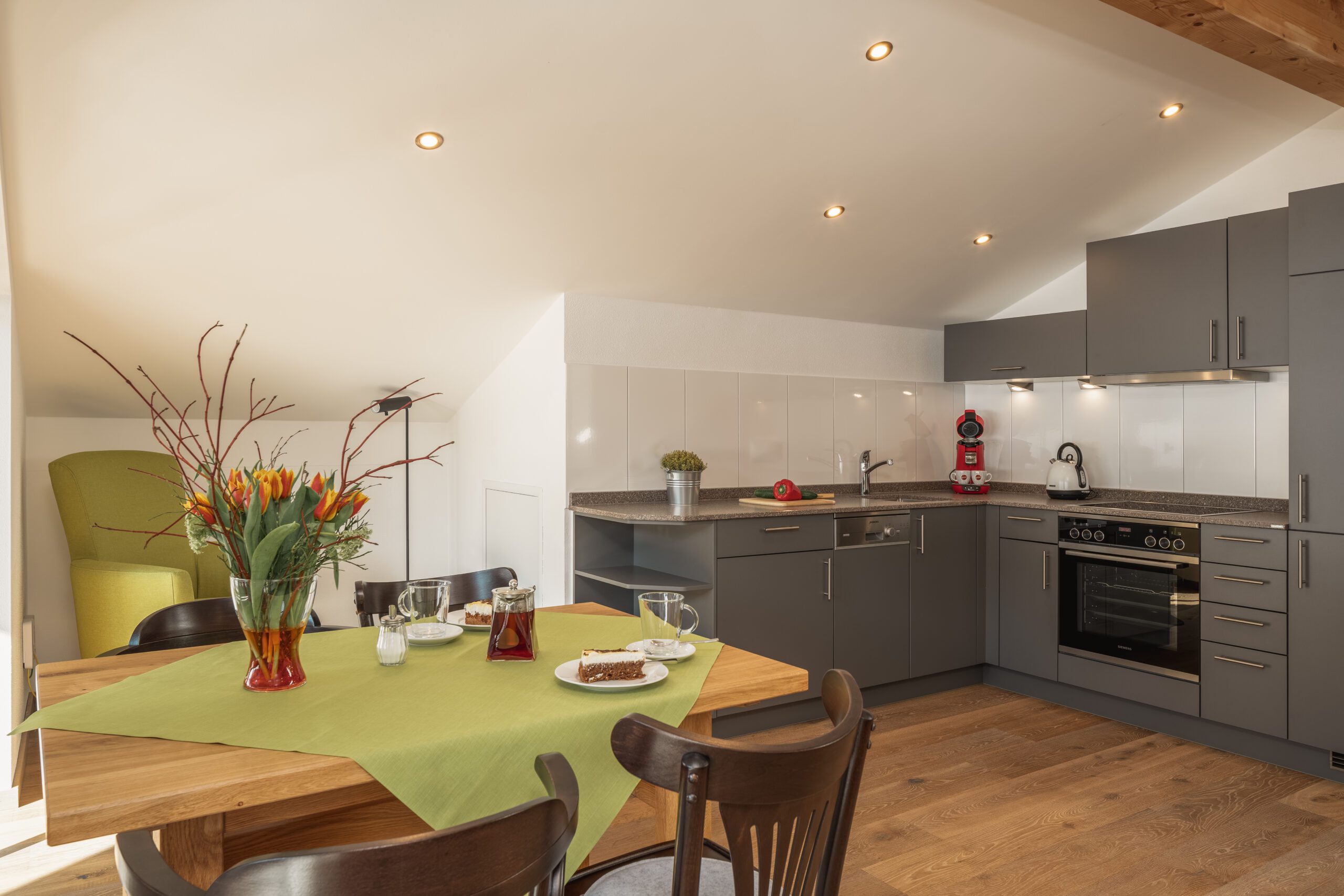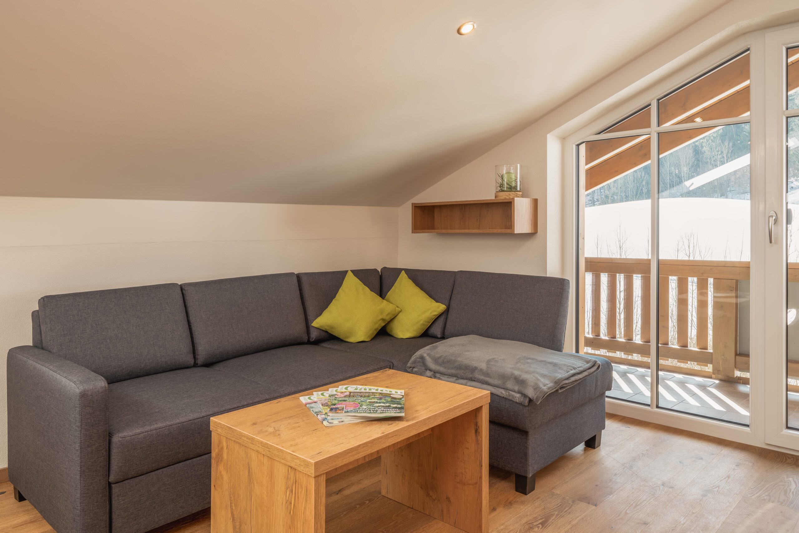 Unsere luxuriöse und einzigartige Suite befindet sich im Dachgeschoss des Hauses und ermöglicht somit einen wundervollen Blick auf das Kaisergebirge und die umliegende Umgebung. Der große Balkon lädt im Sommer zu einem entspannten Frühstück im Freien ein. Dieser grenzt direkt an den großen Wohn- und Essbereich der Suite. Die geräumige Küche lässt keine Wünsche offen. Das Schlafzimmer ist ausgestattet mit einem bequemen Boxspringbett. Auf Wunsch ist eine weitere Schlafmöglichkeit vorhanden. Die Rainshowerdusche und das Dusch – WC im Badezimmer vervollständigen die luxuriöse Suite.