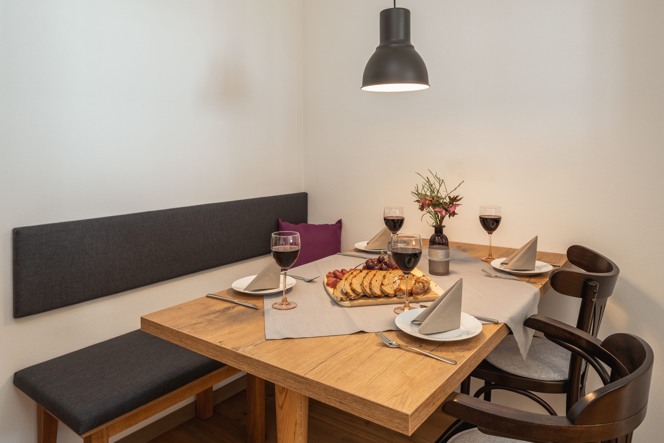 Die geräumige Ferienwohnung befindet sich im EG und ist bedingt behindertengerecht. Der große Eingangsbereich mit viel Stauraum führt direkt in den offenen Wohn- und Essbereich. Die Küche ist komplett ausgestattet. Boxspringbett, Flachbild TV, Kaminofen und eine gemütliche Sitzecke laden zum abendlichen Entspannen ein. Auf Wunsch ist eine weitere Schlafmöglichkeit vorhanden. Das große, geräumige Badezimmer beinhaltet eine ebenerdige Dusche / Rainshower und eine Badewanne und lässt somit keine Wünsche offen. Zusätzlich sind alle Bäder mit einem Dusch – WC ausgestattet. An die überdachte Terrasse grenzt die Wildblumenwiese mit dem Naturgarten.